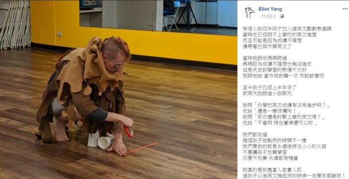 有個小孩四年級才加入這英文戲劇表達課當時他已經跟不上學校的英文進度而且可能是因為成績不理想連帶著也排斥學英文了