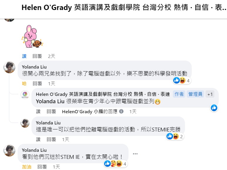 老師午安 女兒週六課後總是常提起Marie老師 也常會學Marie老師說話 女兒對Marie老師不會感到害羞 所以媽媽想說 有Marie老師的團課與一對一的課程 如果能同時都上課的話 效果應該會更好 因為女兒在學校比較少話 但不知是否開始上了這裡的戲劇課後 學校老師說女兒開始變的愛說話了 真心感謝我們能遇到這裡的戲劇課程喔
